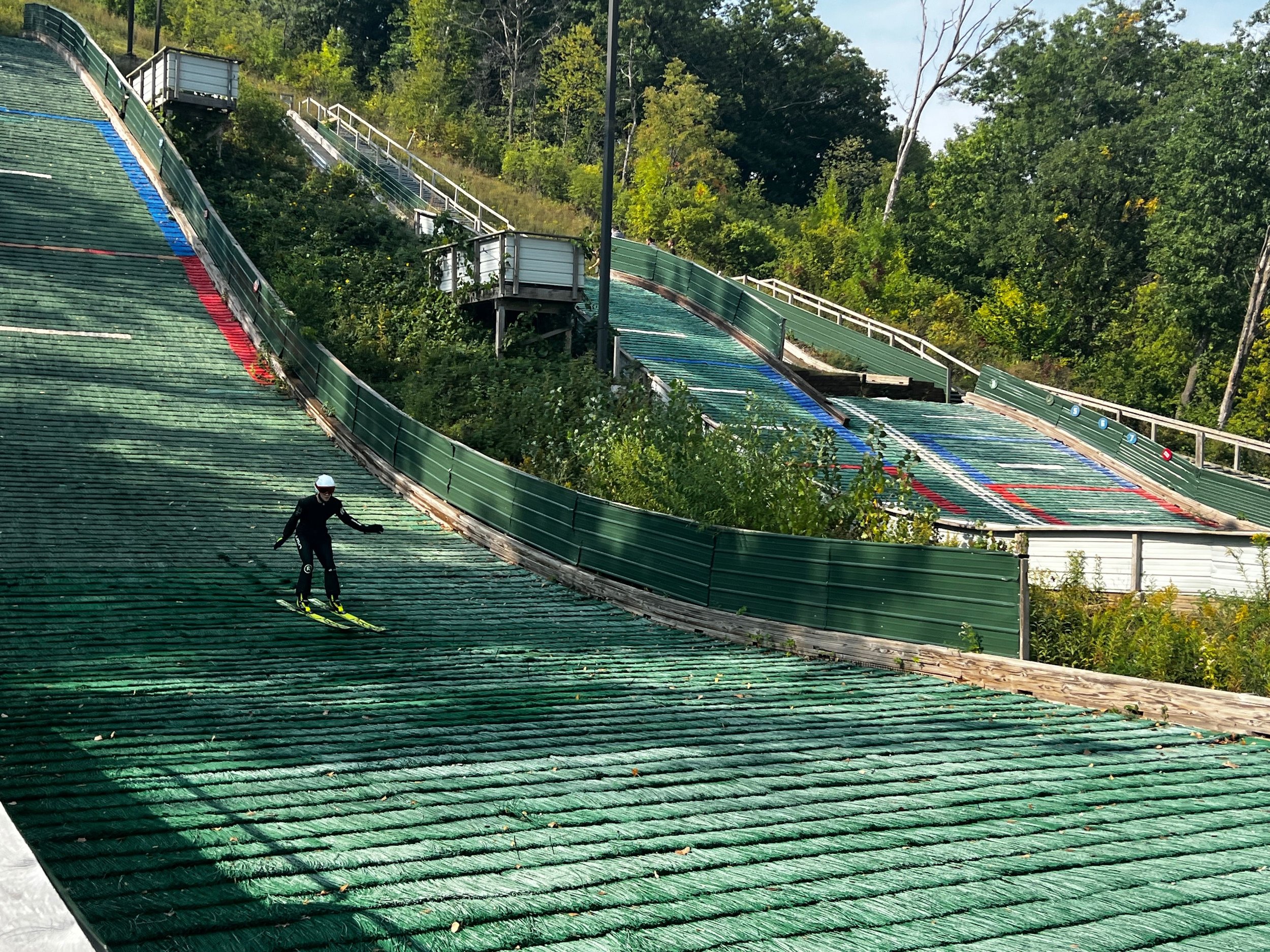 From there, athletes warm up on flat ground, practicing proper positions through fun drills and ski games—while getting comfortable on ski jumping skis.